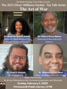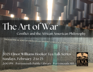 The Black Heritage Trail of New Hampshire (BHTNH) invites the public to the 2025 Elinor Williams Hooker Tea Talk Series themed “The Art of War: Conflict and the African American Philosophy.” The 2025 Tea Talks begin on February 2 at Portsmouth Public Library starting at 2:00 PM with a 90-minute facilitated panel titled: “Things They Carried: An African Philosophy on War, Surviving Enslavement, and Citizenship” followed by a community conversation.