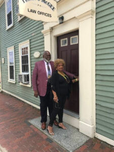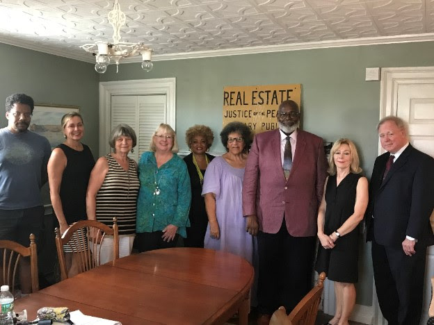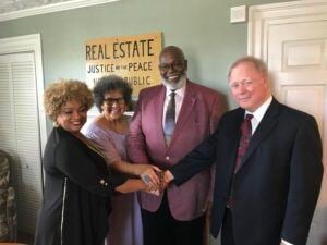 JerriAnne Boggis, executive director of BHTNH, Valerie Cunningham, founder of the Portsmouth Black Heritage Trail and board president Rev. Robert Thompson celebrate with Attorney Jack McGee at the closing on 222 Court Street July 31, 2018