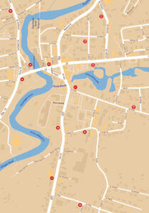 Download a printable PDF of the Downtown Milford Map and Site Key to 13 sites (2-page PDF, printable on 2 pages of letter-size paper)