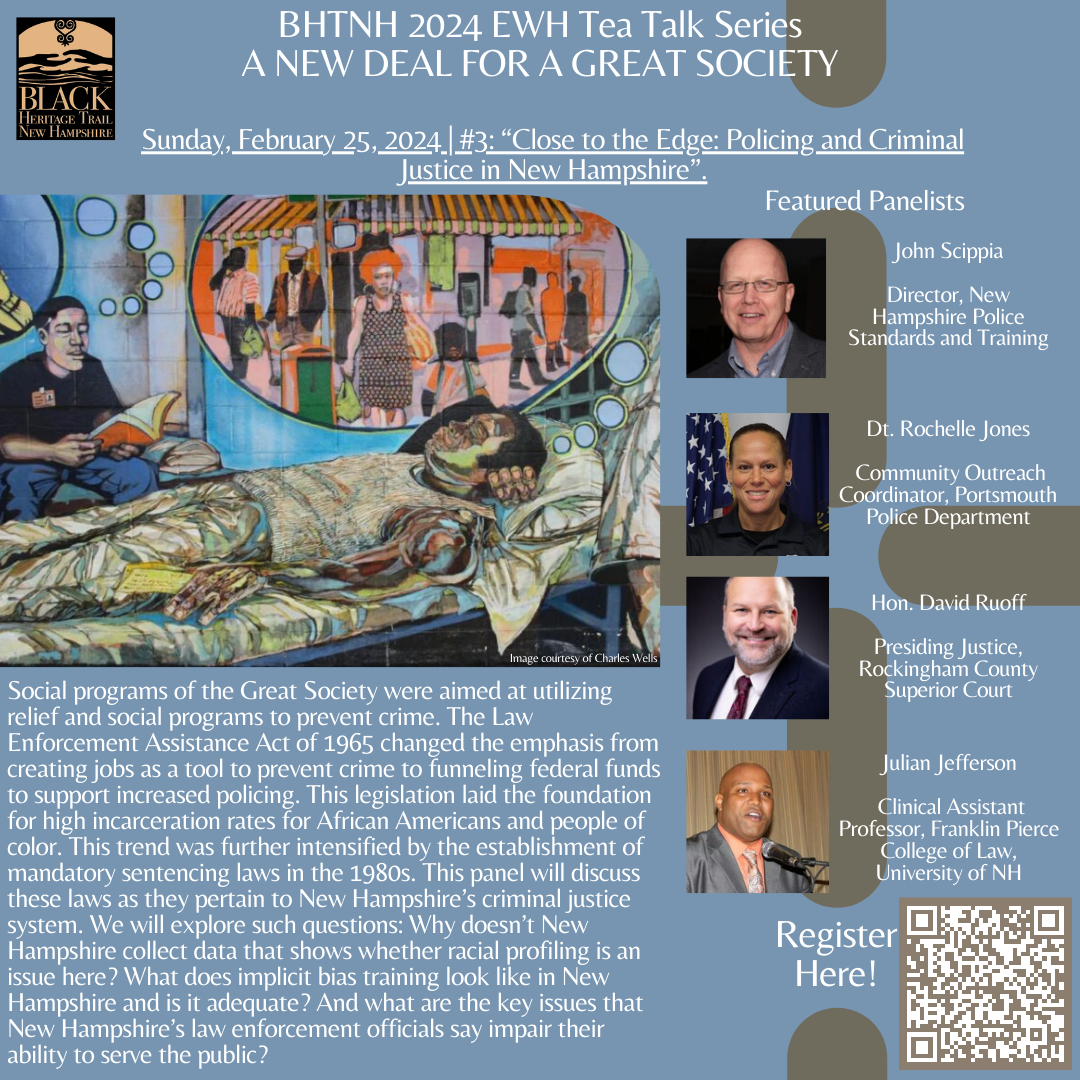 Portsmouth, NH – The Black Heritage Trail of New Hampshire (BHTNH) is excited to spotlight the fourth event in the Elinor Williams Hooker Tea Talks 2024 series, "Close to the Edge: Policing and Criminal Justice in New Hampshire." This crucial discussion, set for February 25, 2024, at the Portsmouth Public Library, promises to be a cornerstone of this year's series, themed "A New Deal for A Great Society."