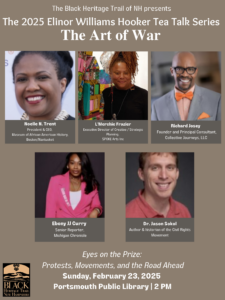 The Black Heritage Trail of New Hampshire (BHTNH) invites the public to attend the fourth panel in its 2025 Elinor Williams Hooker Tea Talk Series, themed “The Art of War: Conflict and the African American Philosophy.” The panel discussion will take place on February 23, 2025, at the Portsmouth Public Library, starting at 2:00 PM. The event will be both in-person and available virtually.