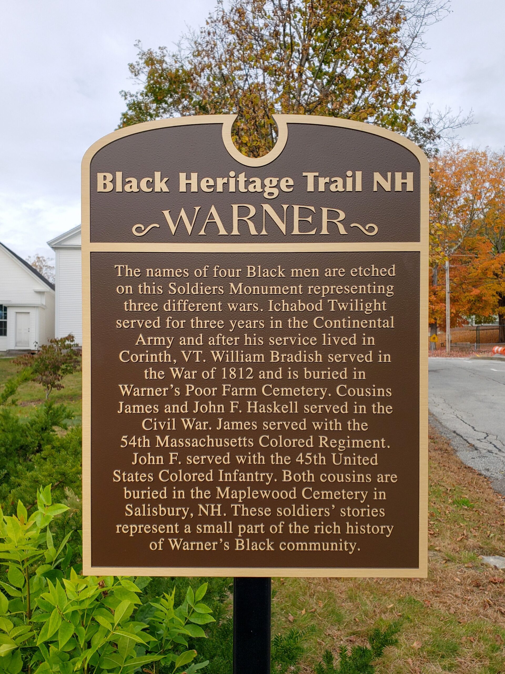 This marker represents soldiers from three different wars. Ichabod Twilight served for three years in the Continental Army and after his service lived in Corinth, VT. William Bradish served in the War of 1812 and is buried in Warner's Poor Farm Cemetery. Cousins James andJohn F. Haskell served with the 54th Massachusetts Colored Regiment. John F. served with the 45th United States Colored Infantry. Both cousins are buried in the Maplewood Cemetery in Sailsbury, NH. These soldiers' stories represent a small part of the rich history of Warner's Black community.