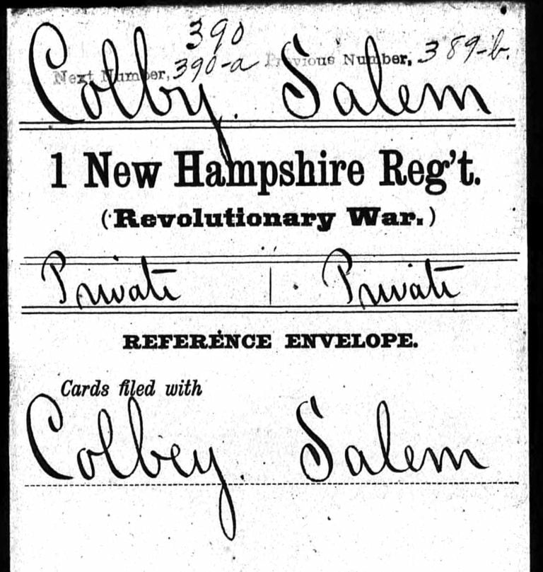 Salem Colby was born sometime in the 1750s and, as a child, was enslaved by Hannah Bowers of Billerica, MA. Salem was sold in 1761 to Lot Colby of Rumford, now Concord, NH. He served in the Revolutionary War — first as a waiter, then as a soldier — in the 1stNew Hampshire Regiment, while still enslaved by Colby. During the war he was severely injured, but gained his freedom as a result of his service.